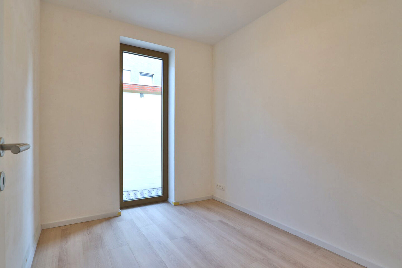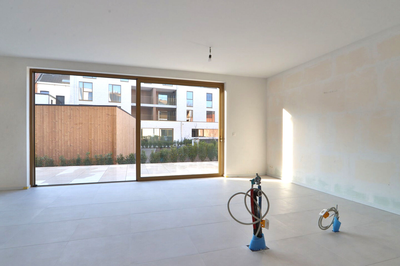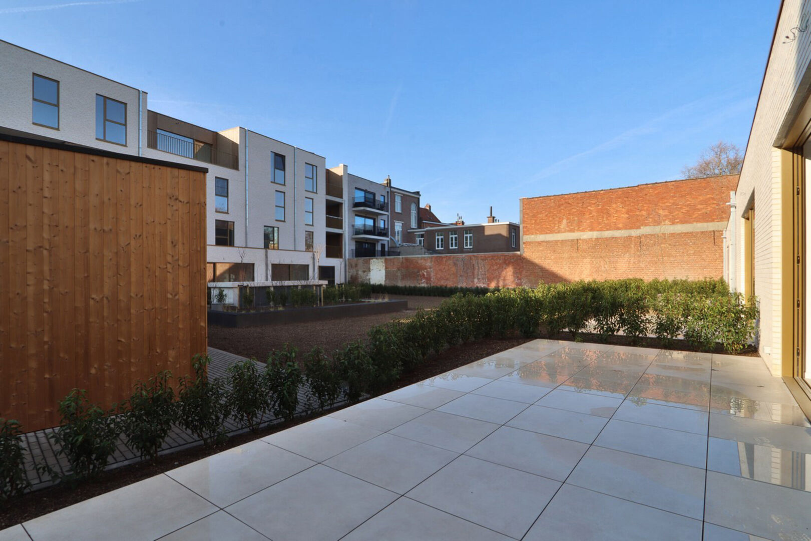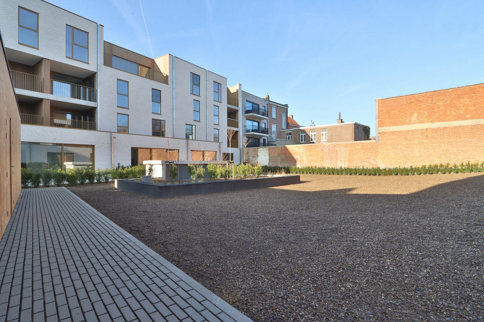 Het appartement beschikt over een bewoonbare oppervlakte van 109,11 m² en omvat drie volwaardige slaapkamers. De aangename leefruimte geeft uit op het ruime terras van 24,08 m², dat afgebakend is met een haagje, waardoor u in alle privacy kan genieten van het buitenleven. De terrassen en tuintjes van de gelijkvloerse appartementen zijn bovendien gelegen in een grote, afgesloten gemeenschappelijke tuin, wat zorgt voor een groene, rustige en veilige woonomgeving.